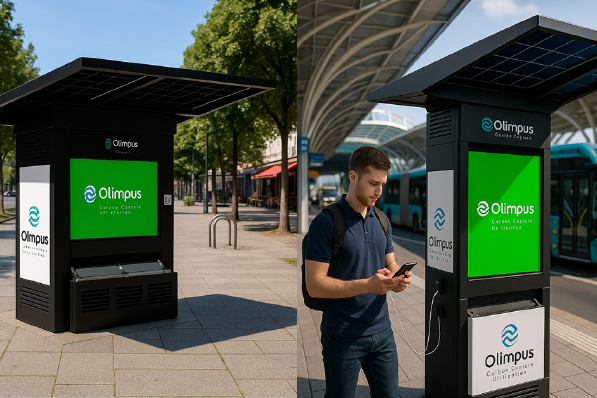 Prominent display of corporate branding on Olimpus units in high-traffic urban locations, associating your brand with cutting-edge environmental technology.